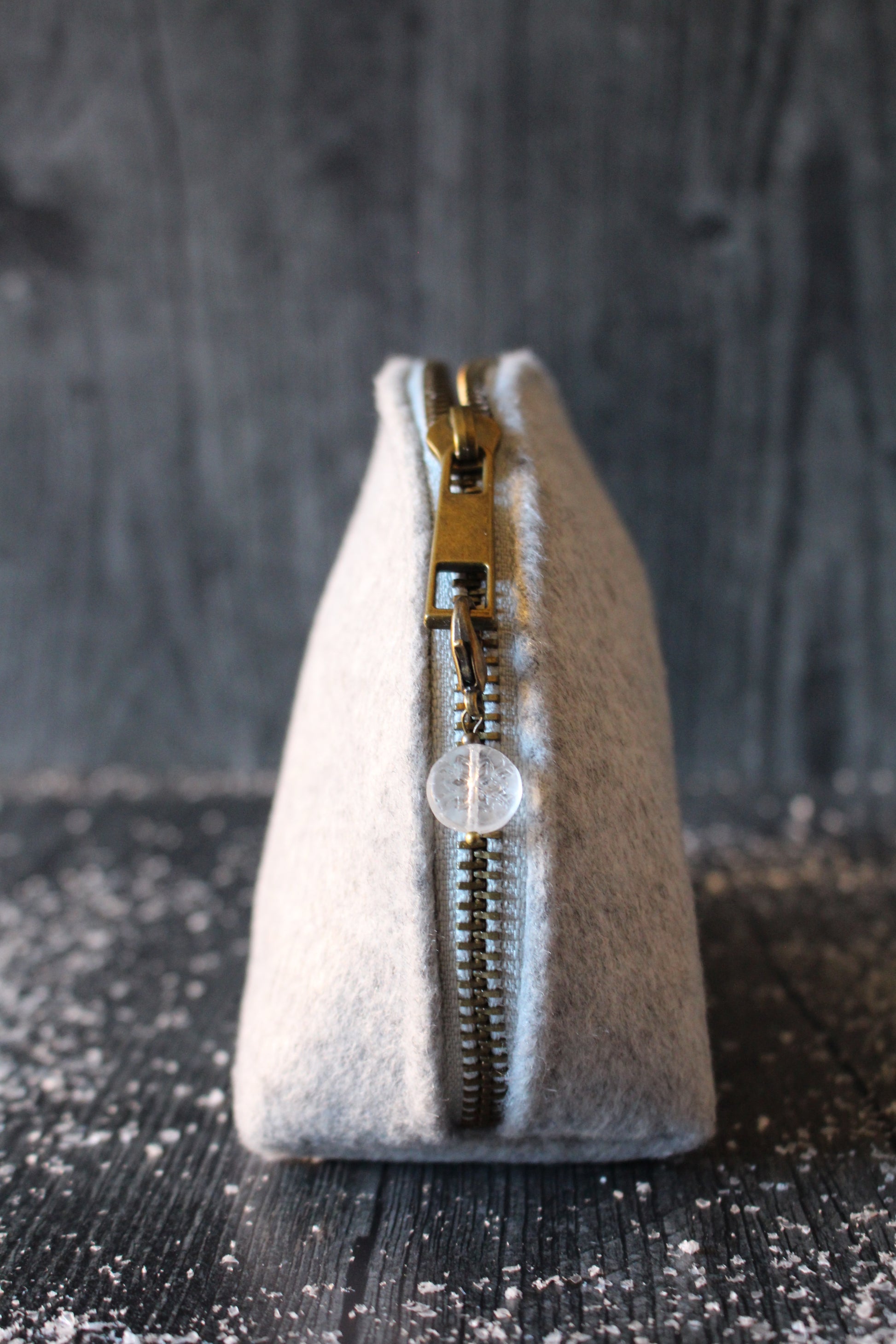 A cute woolen zippered pouch with a designated pocket for your tape measure, a magnetic small scissor pocket and a ribbon loop for stitch markers. Made from a wool blend felt with a brass metal zipper and optional coordinating snowflake zipper pull.