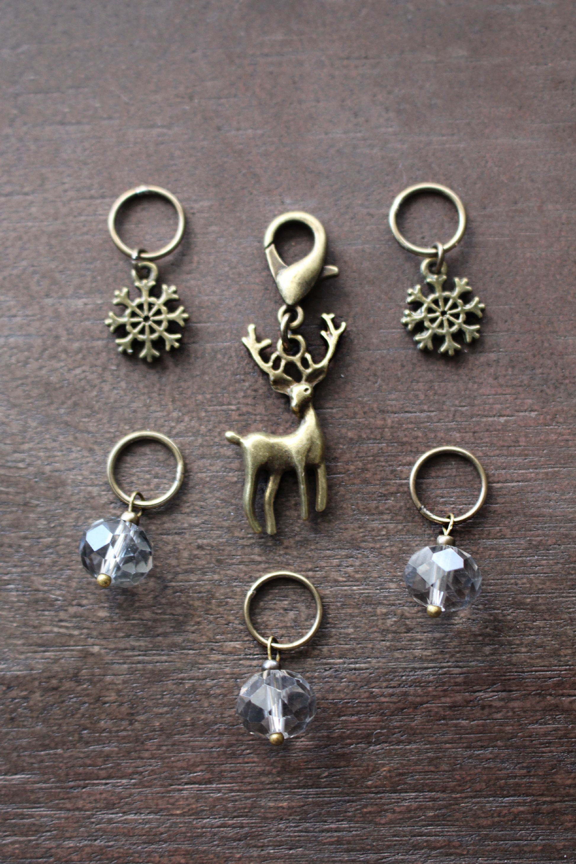 Capture the magic of winter in every stitch with our Arctic Reindeer Stitch Markers, a delightful blend of whimsy and elegance. Adorn your stitches with the enchanting beauty of antique bronze intricate winter charms with sparkling crystal glass snowflakes, adding a touch of seasonal charm to your knitting projects. Crafted with meticulous detail, these markers are more than just tools – they're miniature works of art that transport you to a winter wonderland with each stitch. This stitch marker set features 5 snowflake ring markers with 1 reindeer progress keeper.