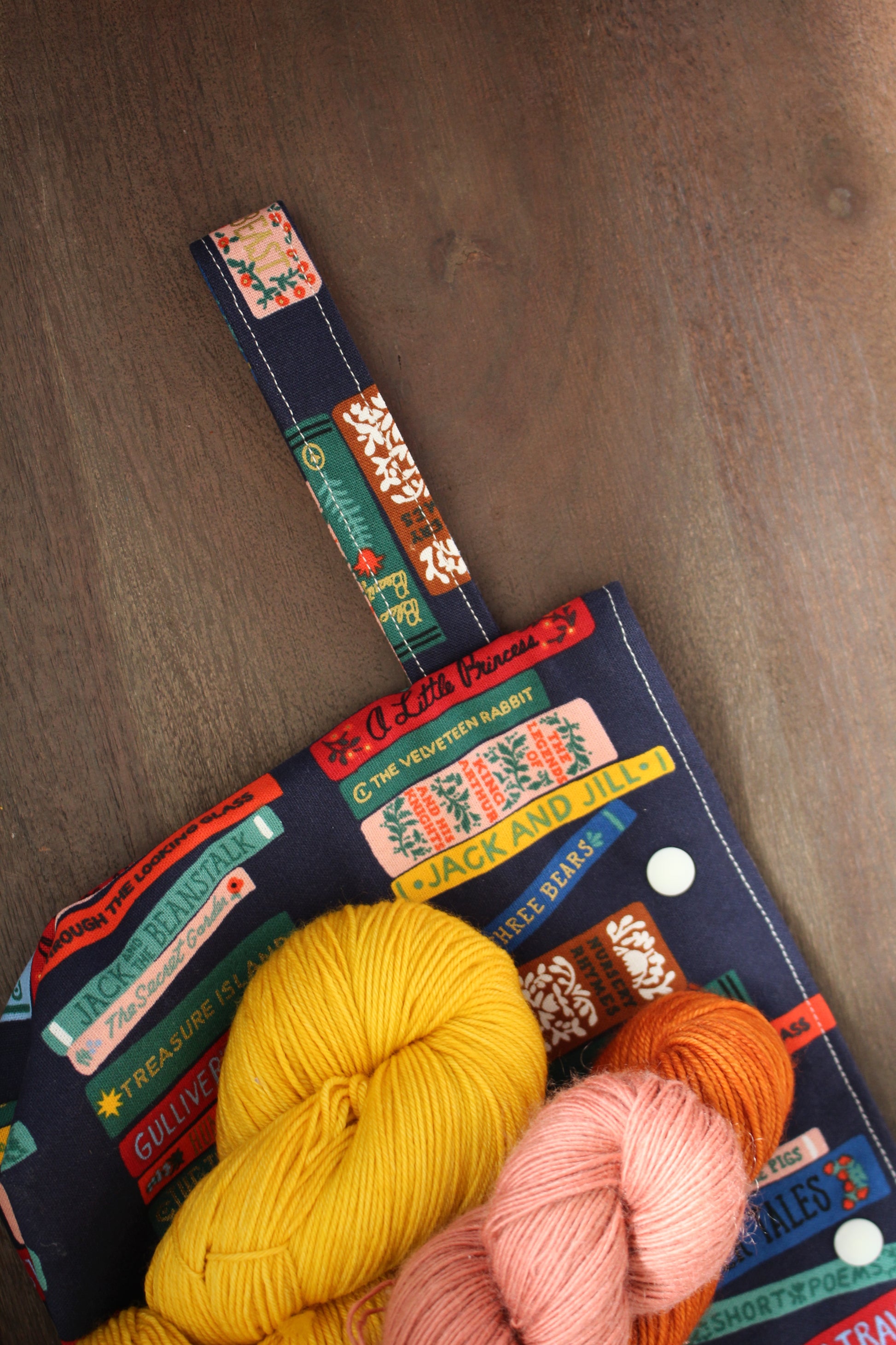Exterior handle for easy carrying, and a handy interior ribbon loop to attach a set of Stitch Markers, Scissor Chain or other tools. Shown with our Reading Hour Progress Keeper Trio.