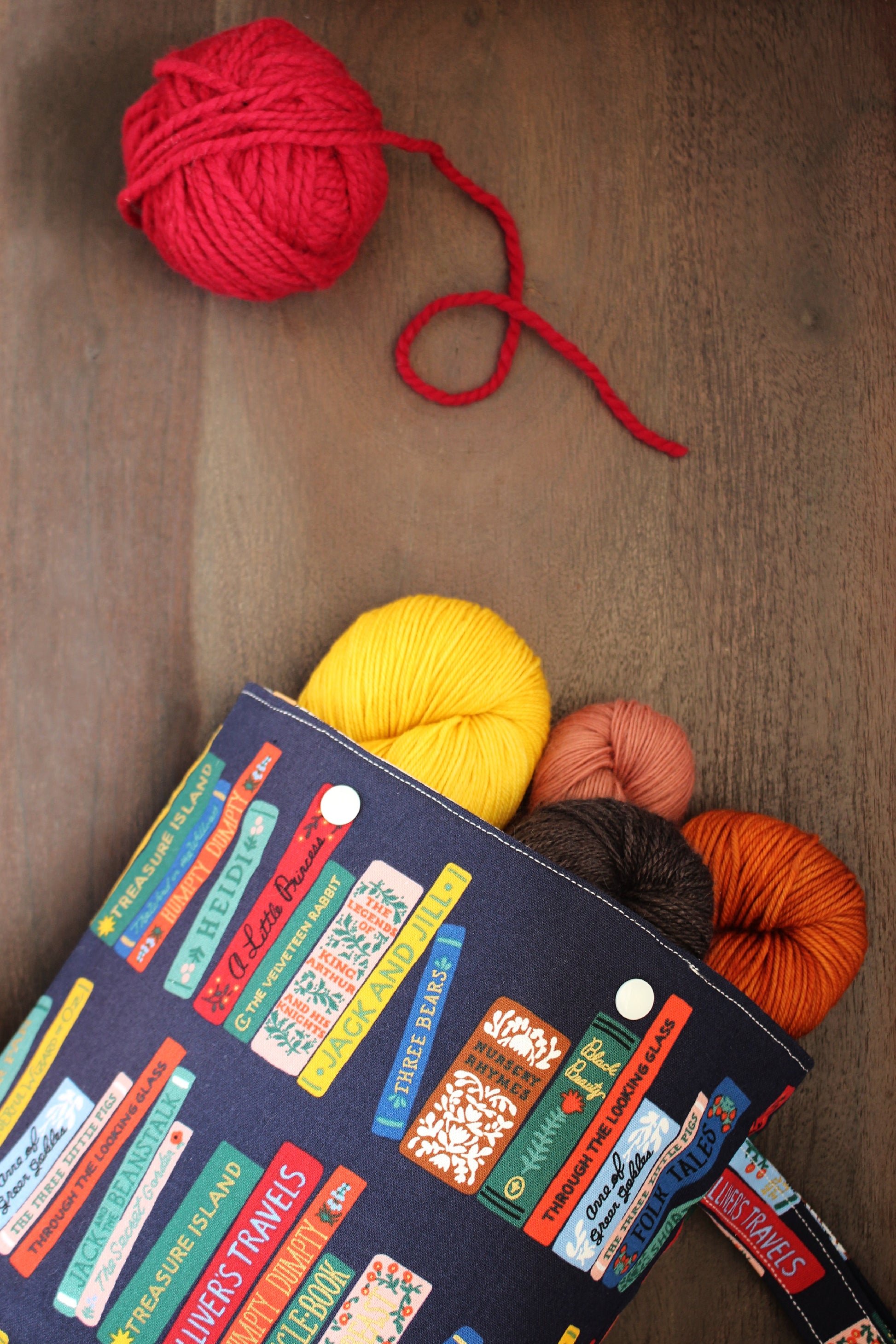 Here is the perfect bag to house your next knitting project while showing off your love of reading! Designed for easy access, with an extra layer that allows it to stand on its own, hold its shape and stay open while working. When you’re finished, the top closes securely with 2 snaps to keep your project safe.