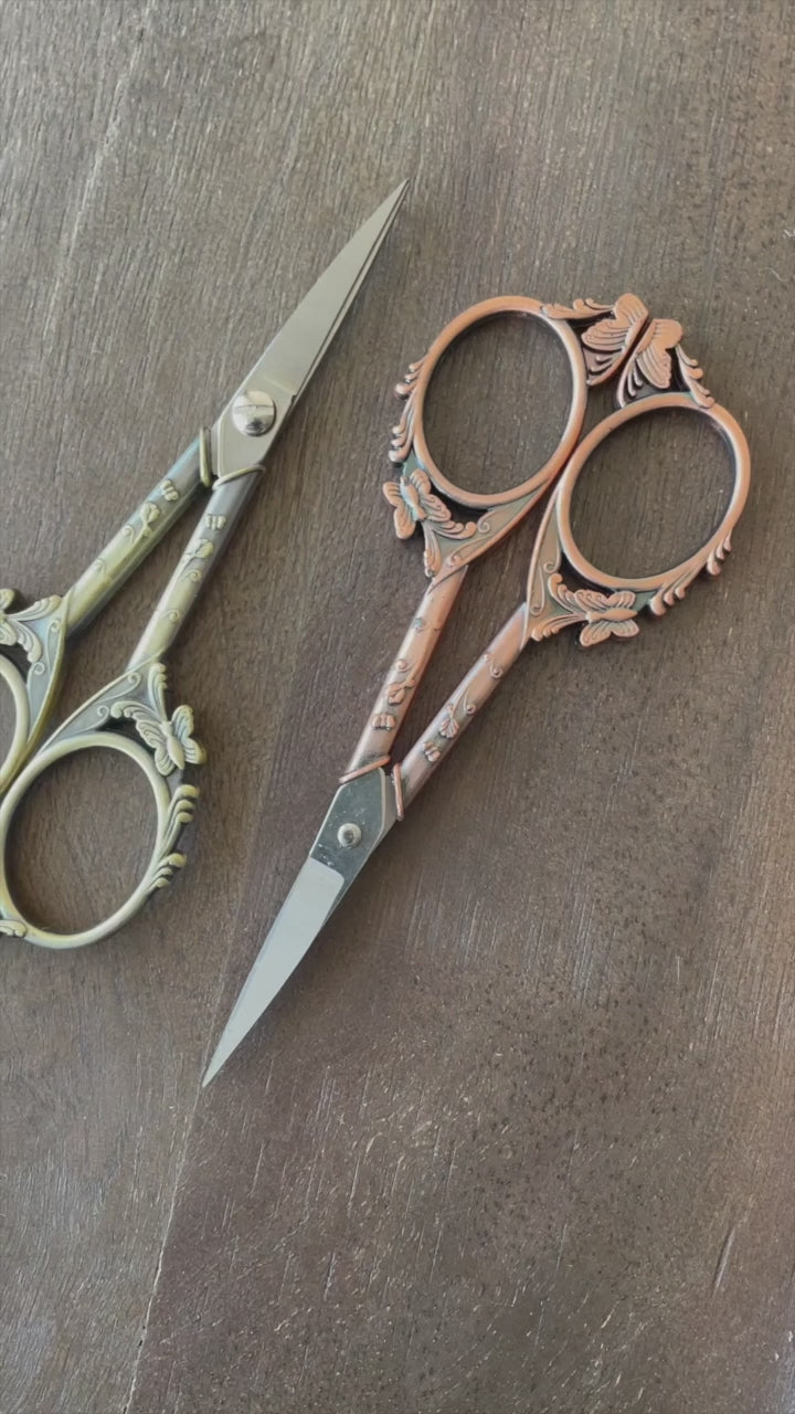 Embroidery scissors with high-quality stainless steel blades and beautifully engraved butterfly handles. Perfect for snipping yarn tails and threads, these little beauties would make an elegant addition to any knitting bag or sewing basket.