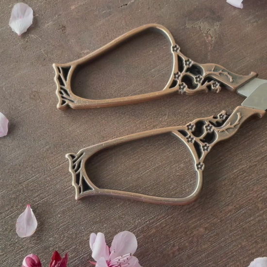 Embroidery scissors with high-quality stainless steel blades and beautifully engraved cherry blossom handles. Perfect for snipping yarn tails and threads, these little beauties would make an elegant addition to any knitting bag or sewing basket.