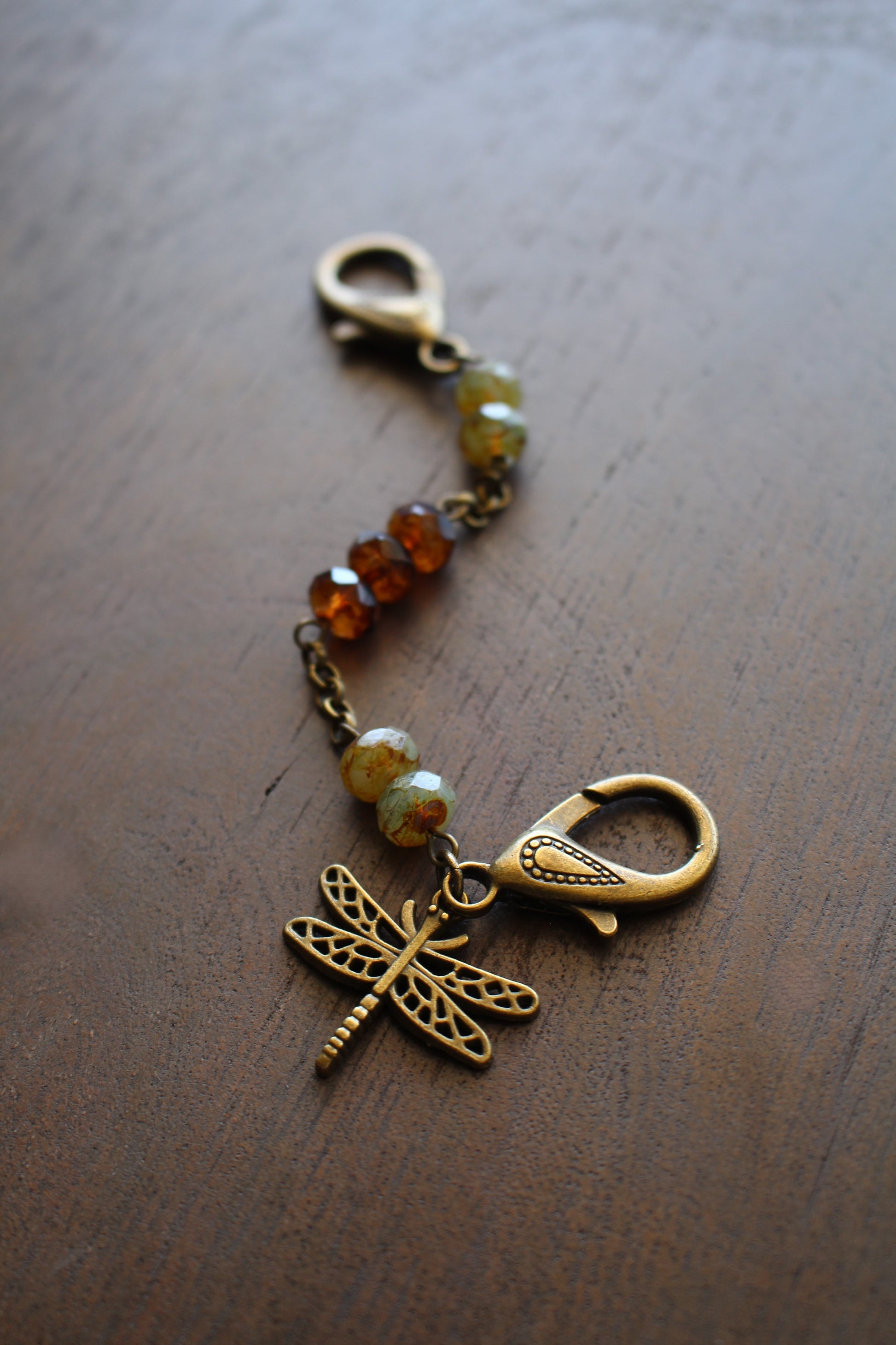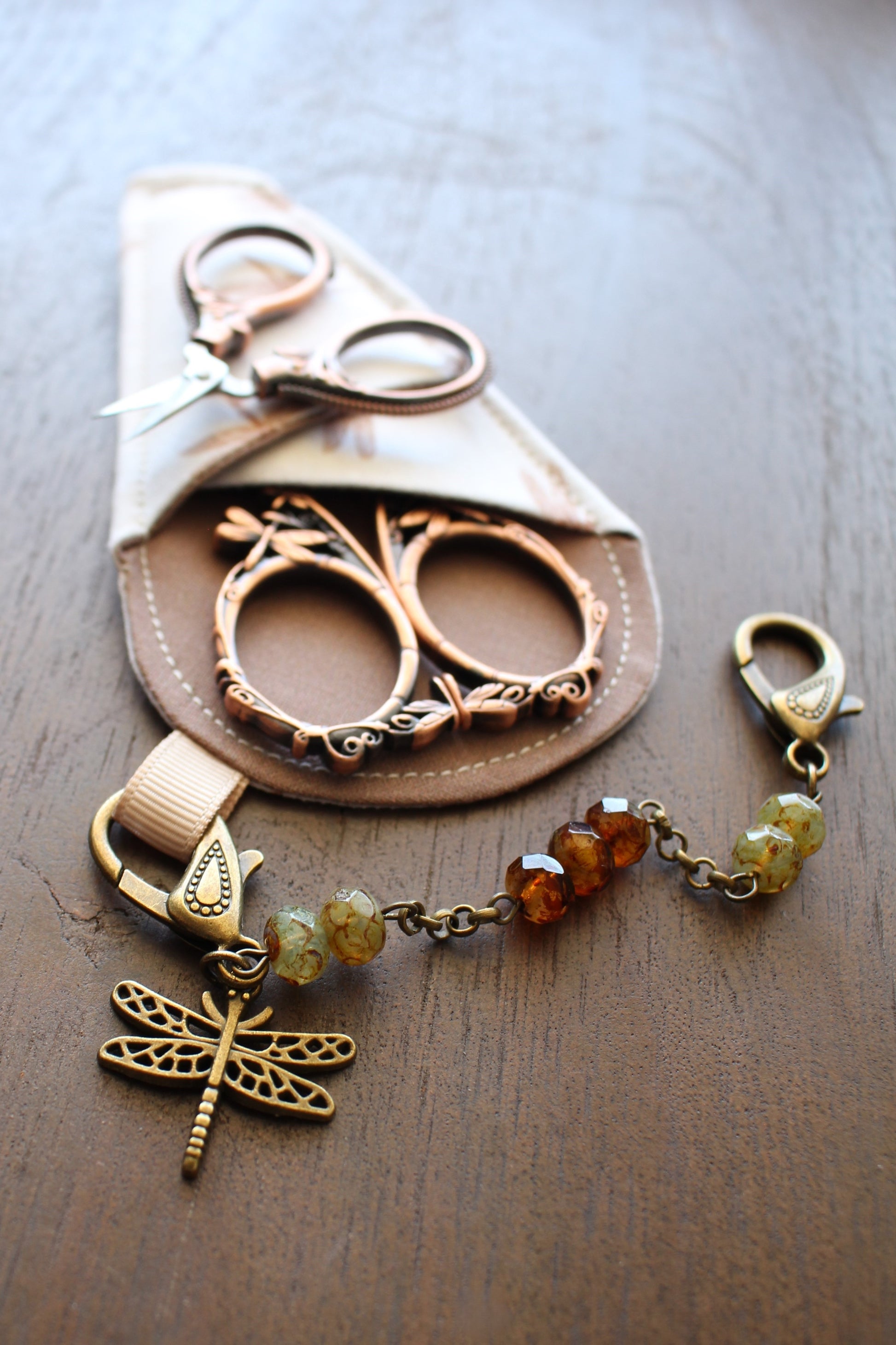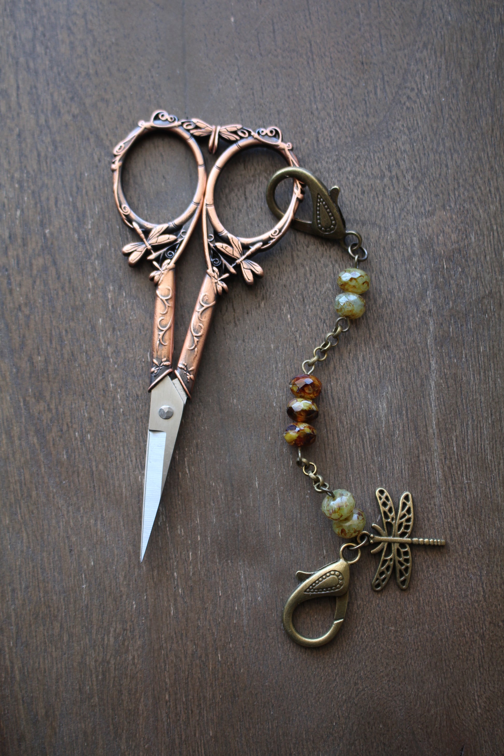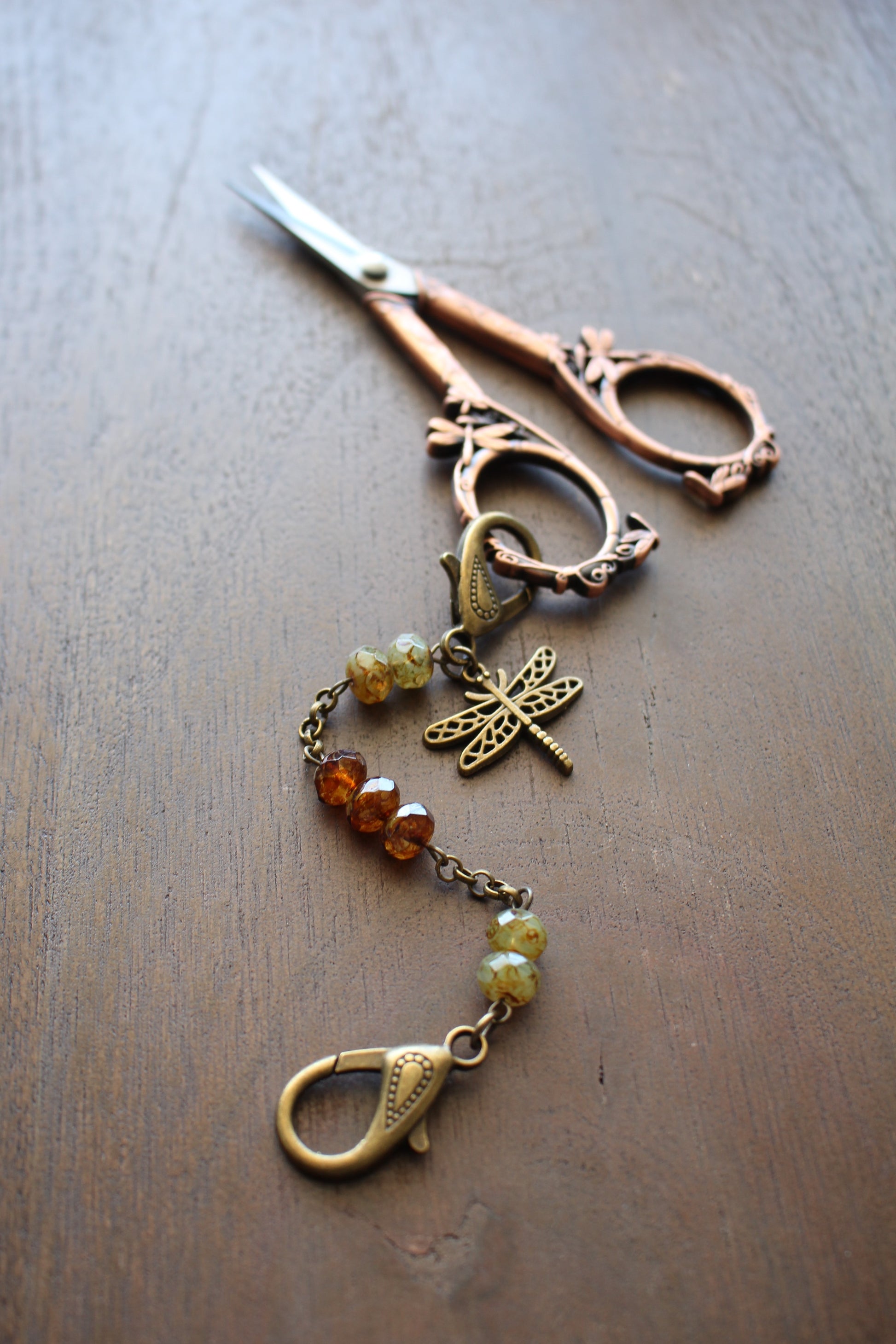 Use these unique and ornate chains to attach your scissors or other accessories to your knitting bag or purse! Each chain features 2 large clasps, lovely Czech glass beads and a bronze dragonfly.