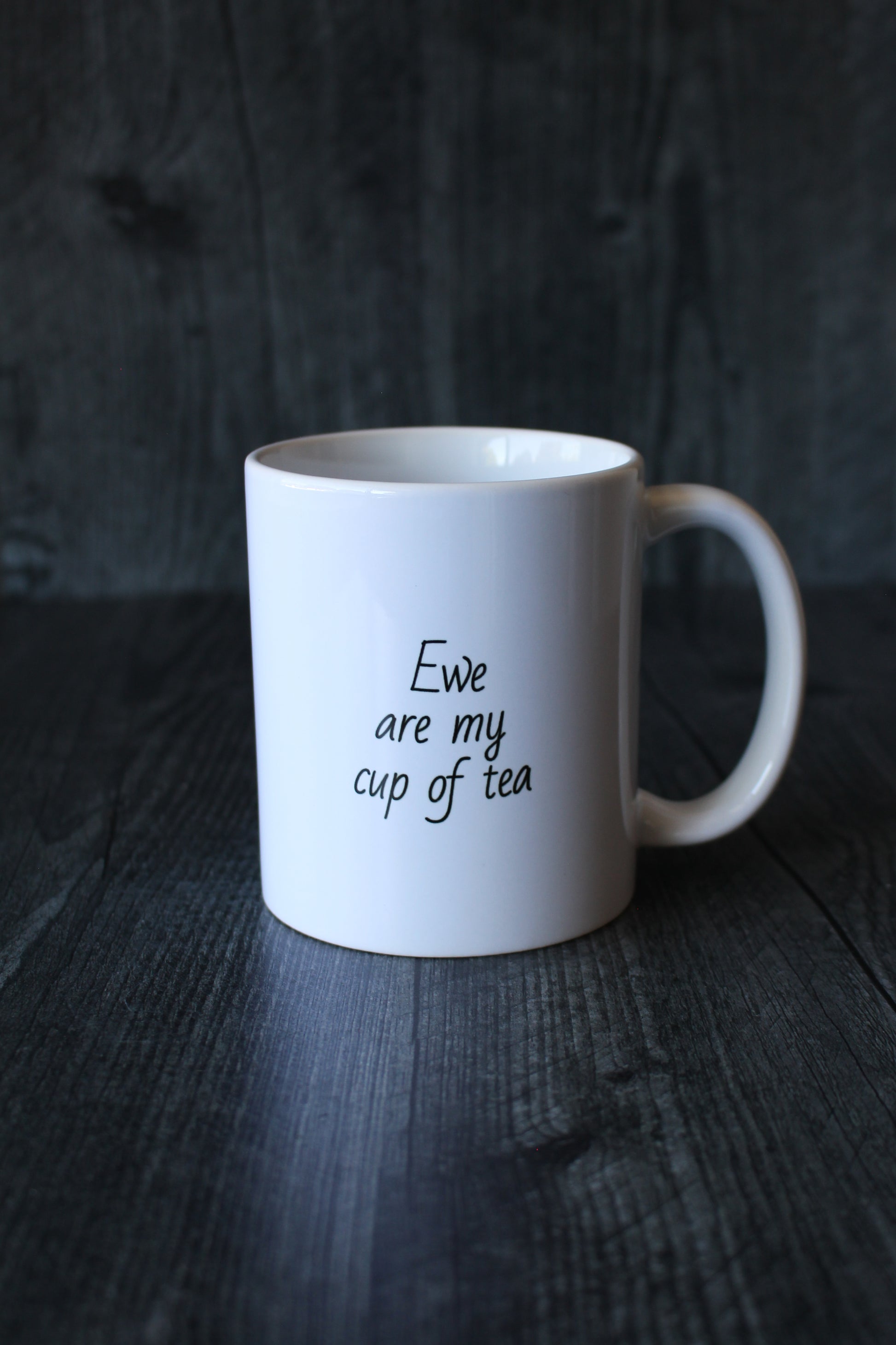 This adorable 11oz white ceramic mug is printed with an original illustration on the front and the words "Ewe are my cup of tea" on the back. Tea bag not included.