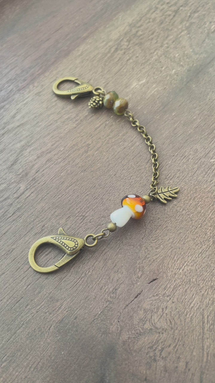 Each chain features 2 large clasps, a glass mushroom , a bronze metal pinecone and leaf and lovely Czech glass beads.