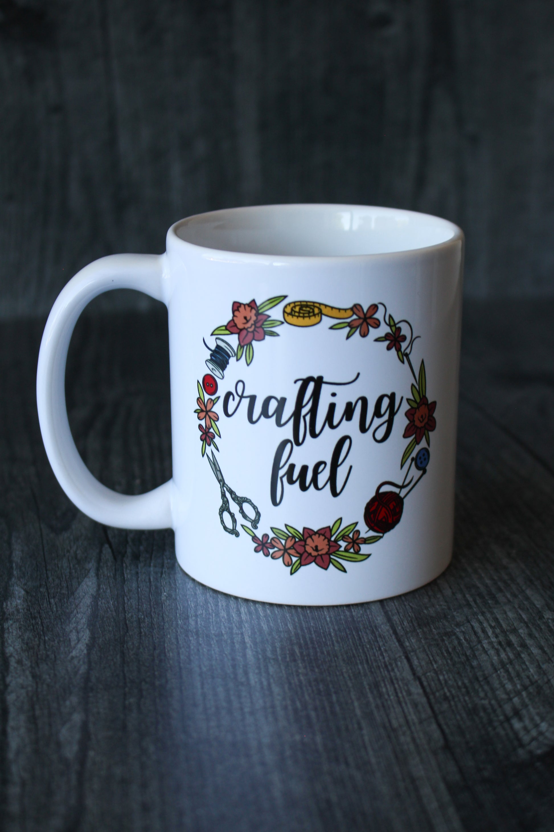 This white ceramic mug is printed with the words "Crafting Fuel" on both sides so it can be seen whichever way it is held. Makes a great gift for mom, grandma, or any crafty loved one in your life.