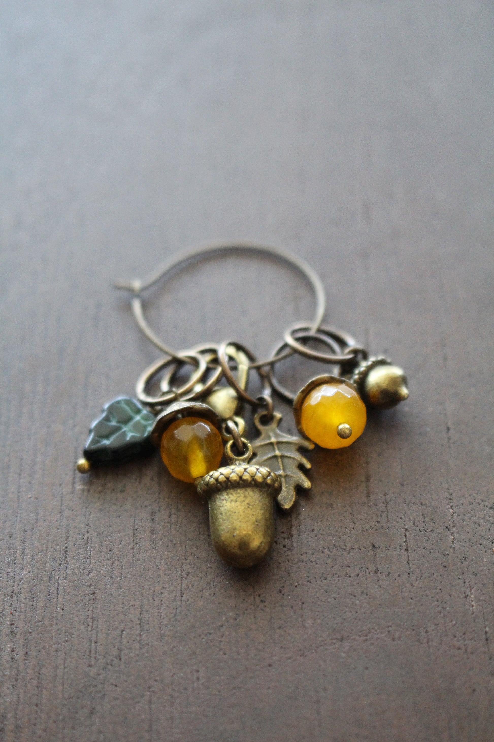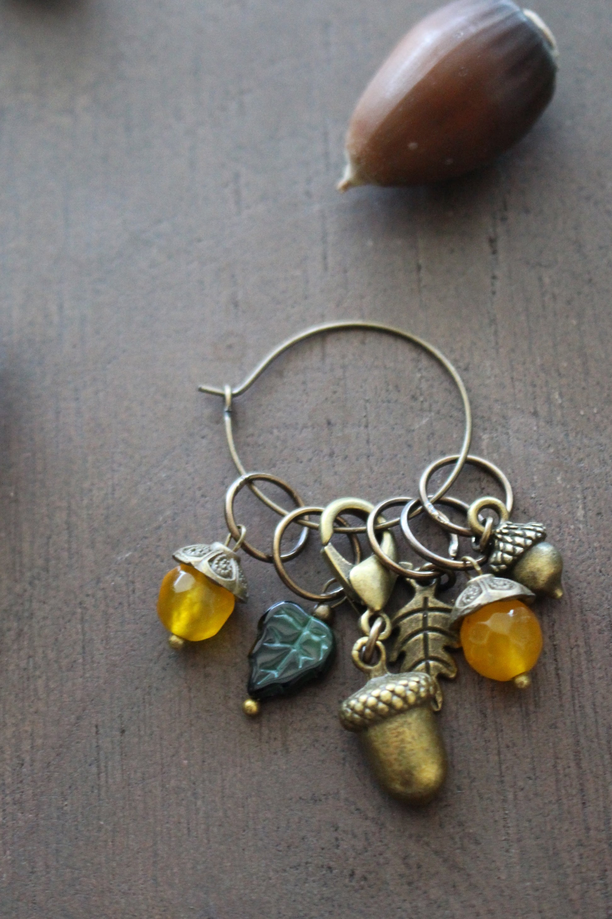 Bring the autumn harvest to your knitting projects this fall with this beautiful acorn inspired stitch marker set. Each consists of 5 ring stitch markers that fit up to a US10 knitting needle and 1 removable progress keeper. Made with Czech glass beads and bronze charms.