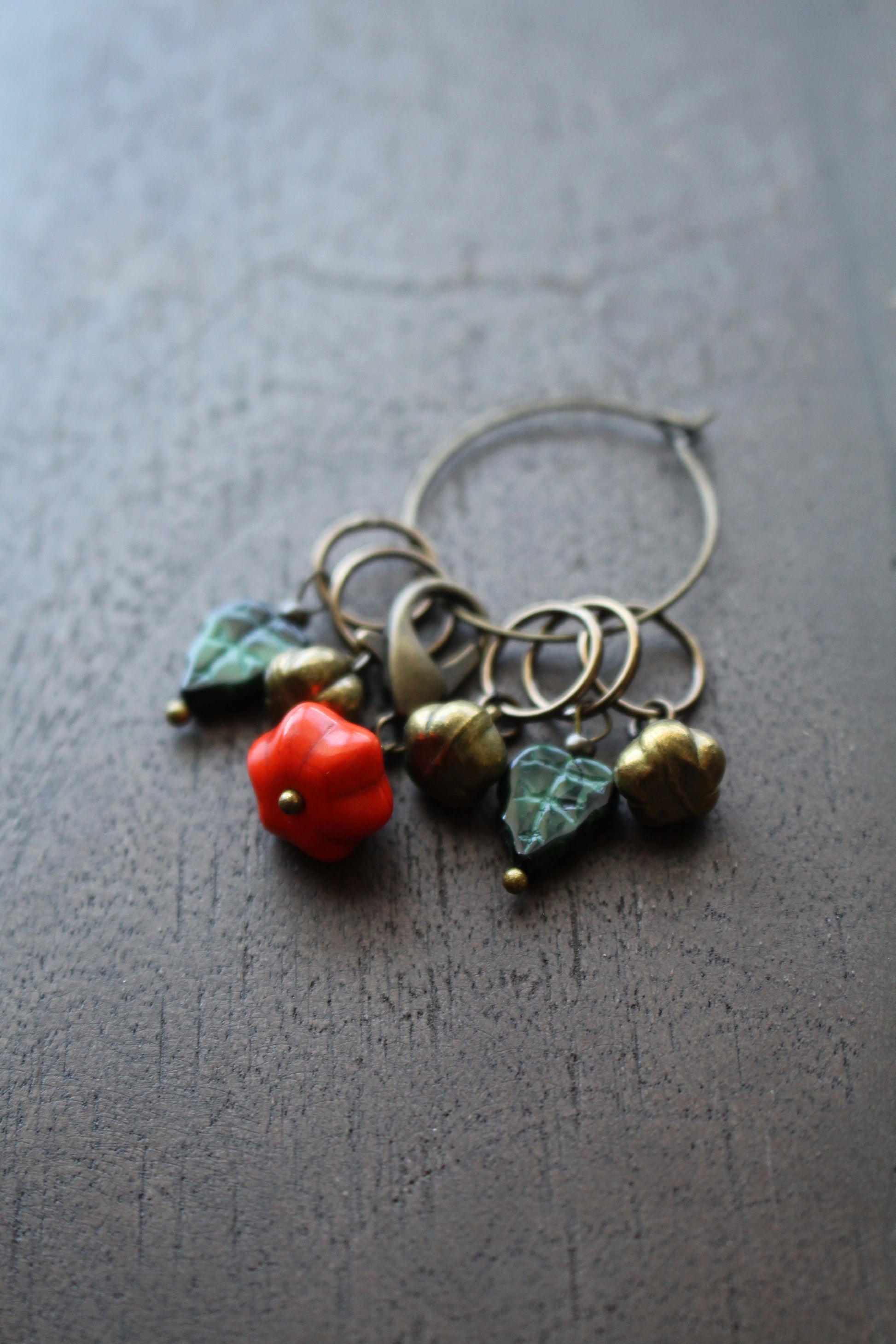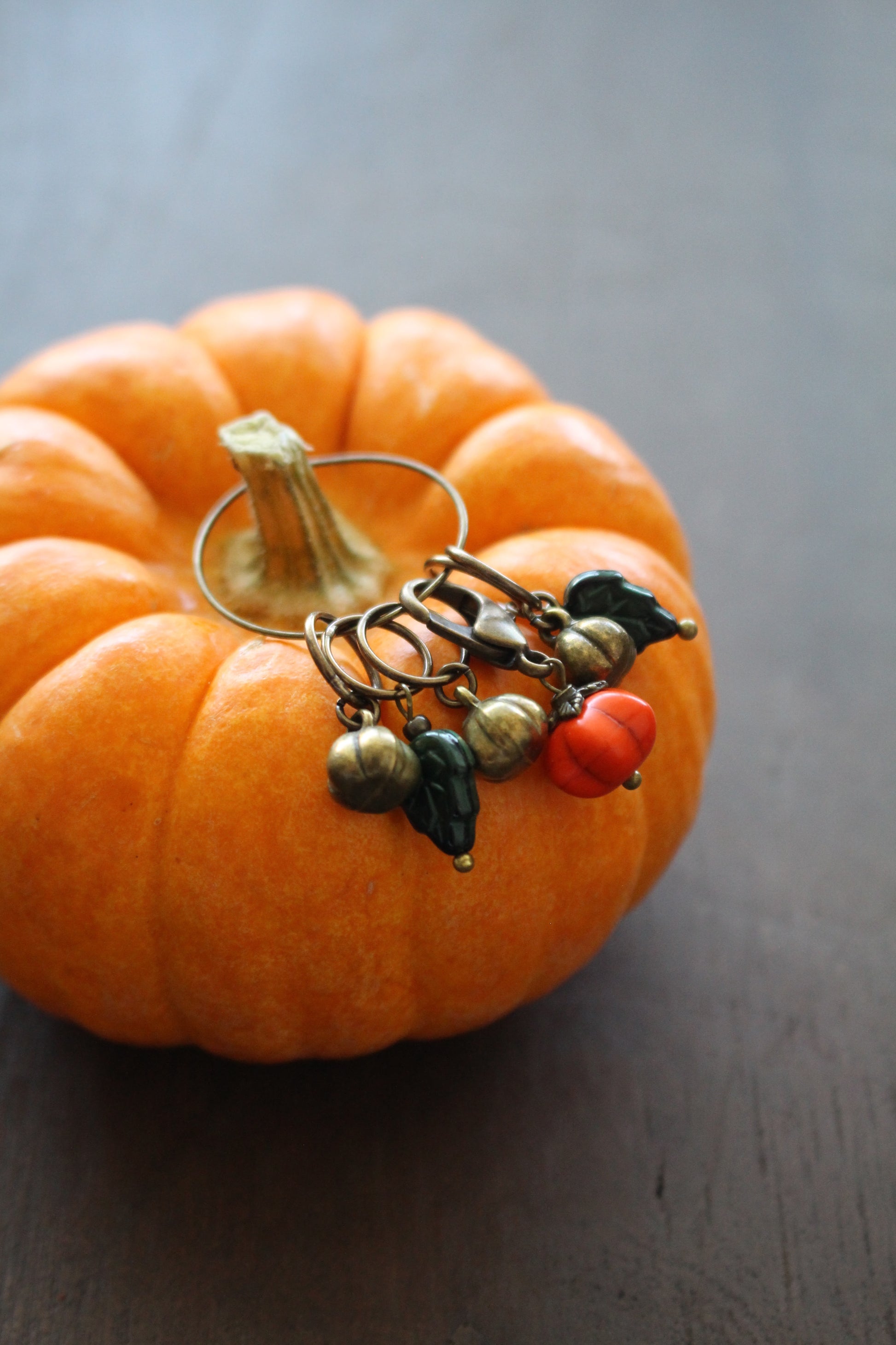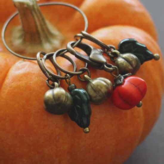 Bring the autumn harvest to your knitting projects this fall with this beautiful pumpkin inspired stitch marker set. Each consists of 5 ring stitch markers that fit up to a US10 knitting needle and 1 removable progress keeper. Made with bronze charms, Czech glass beads and a stone pumpkin.