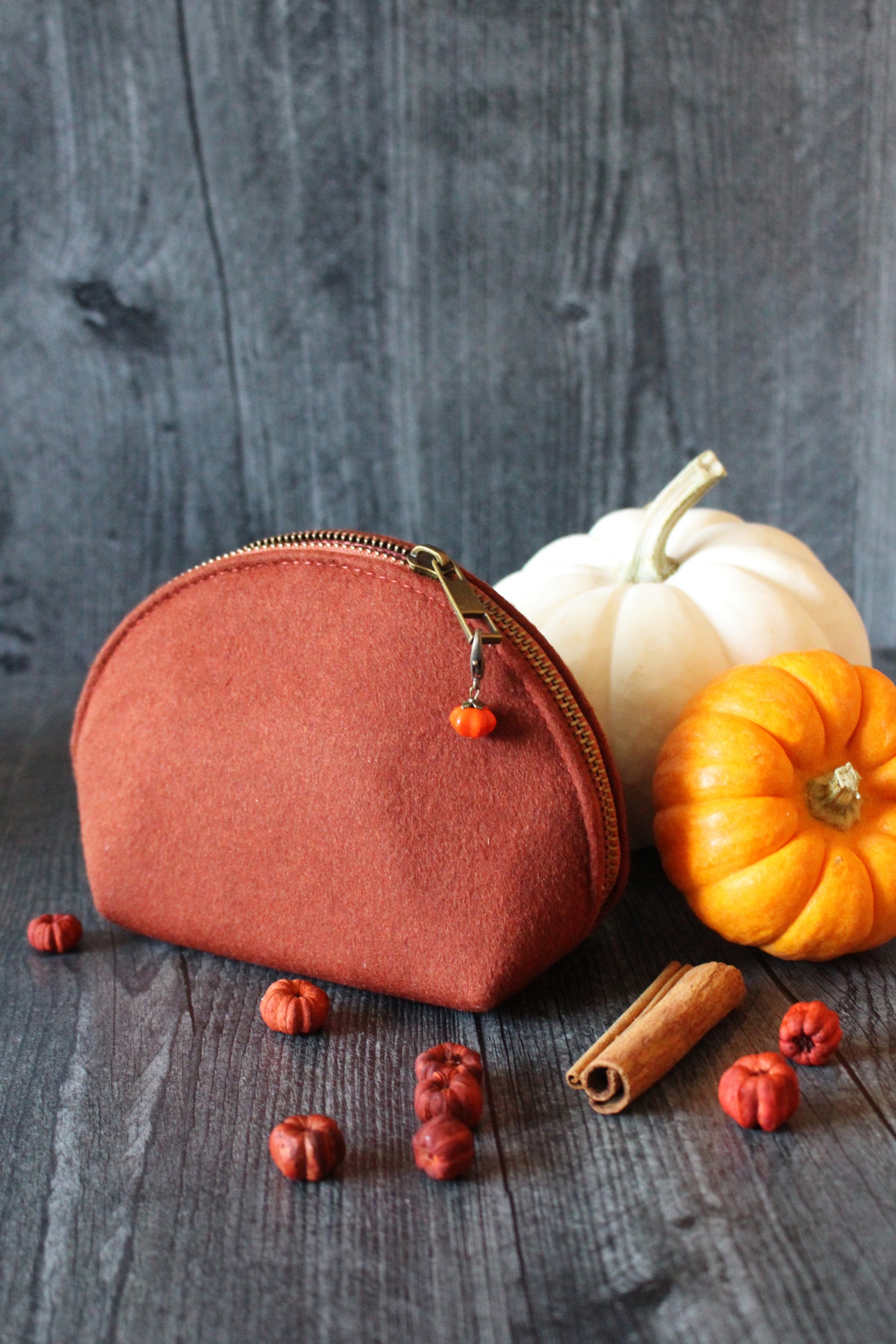 A cute woolen zippered pouch with a designated pocket for your tape measure, a magnetic small scissor pocket and a ribbon loop for stitch markers. Made from a pumpkin colored wool blend felt with a brass metal zipper and optional coordinating pumpkin zipper pull.