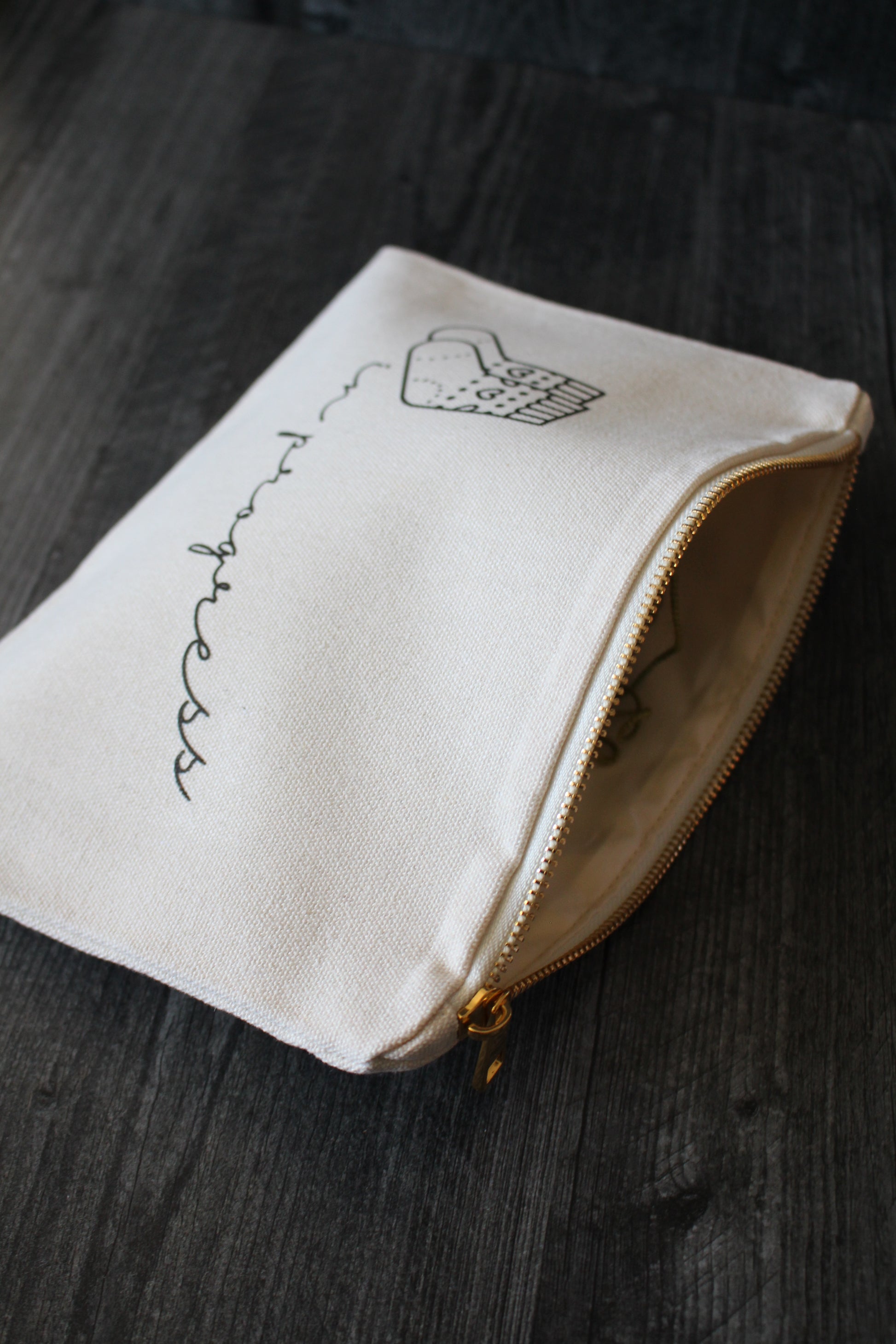 A sweet little pouch to keep your socks-in-progress safe and secure! This pouch is sewn from sturdy 100% cotton canvas with a satiny lining and a gold metal zipper.