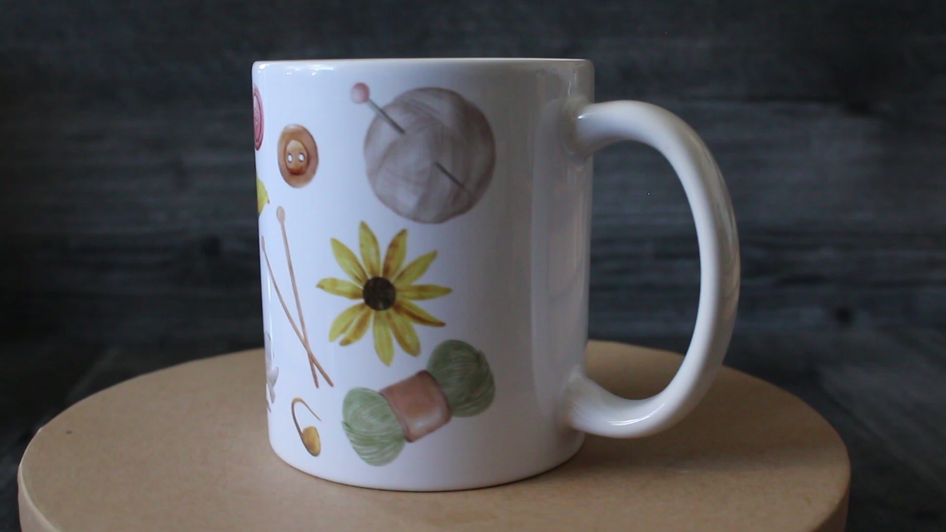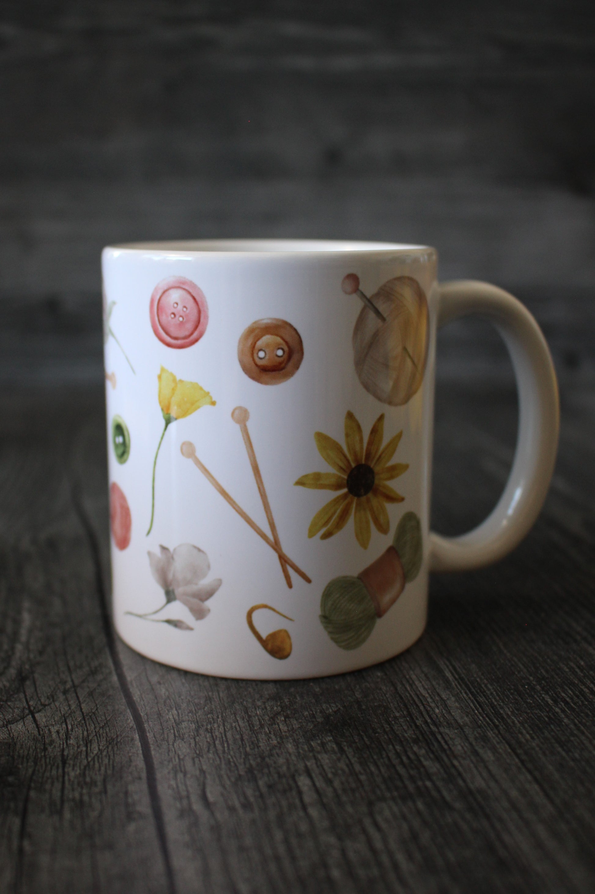 This white ceramic mug is printed with vintage style illustrations that wrap around both sides of the mug. Makes a great gift for mom, grandma, or any crafty loved one in your life.