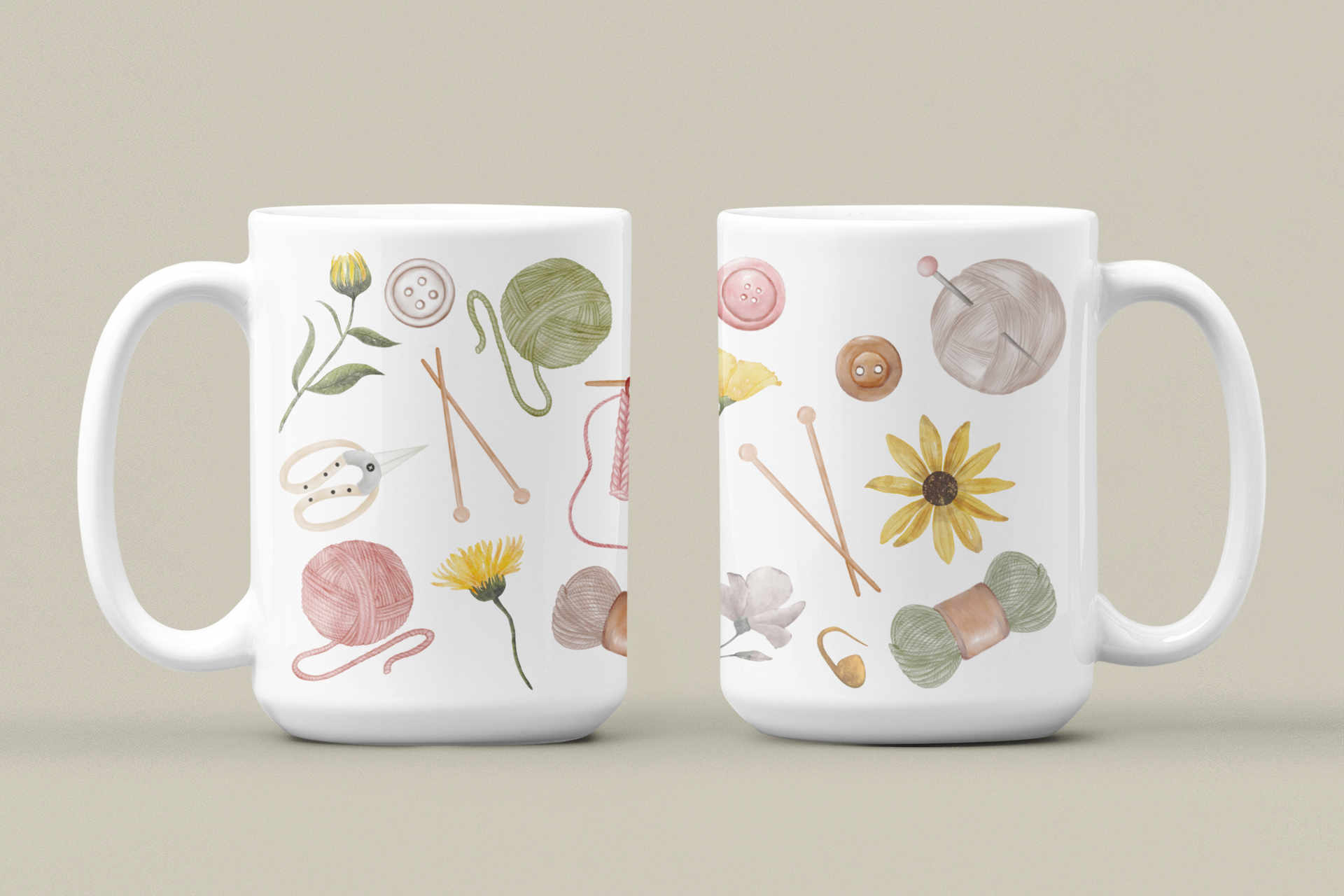 A mug for knitters featuring all the little bits and bobs of your craft.
