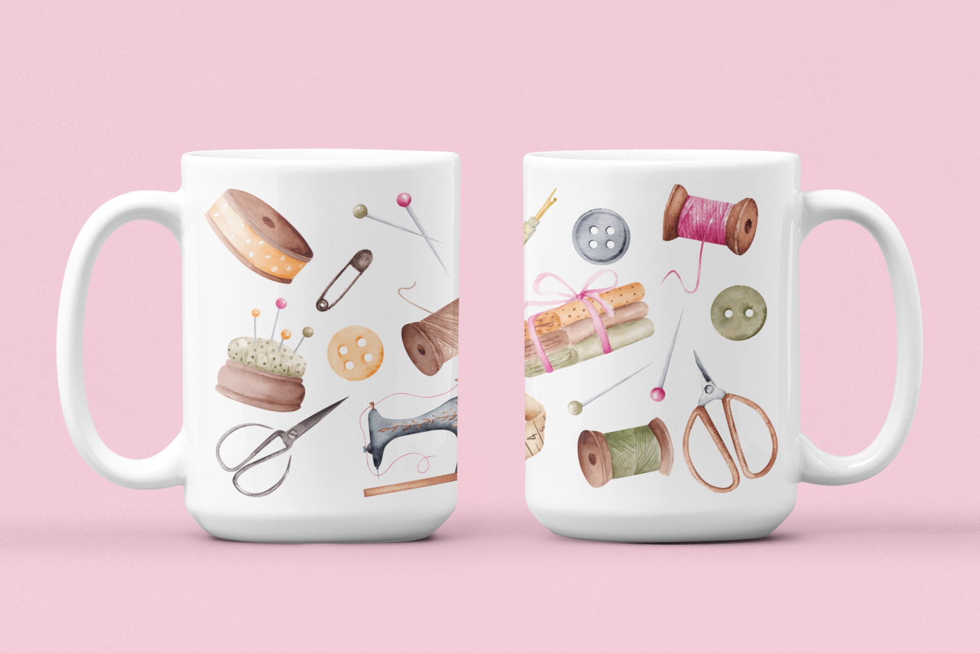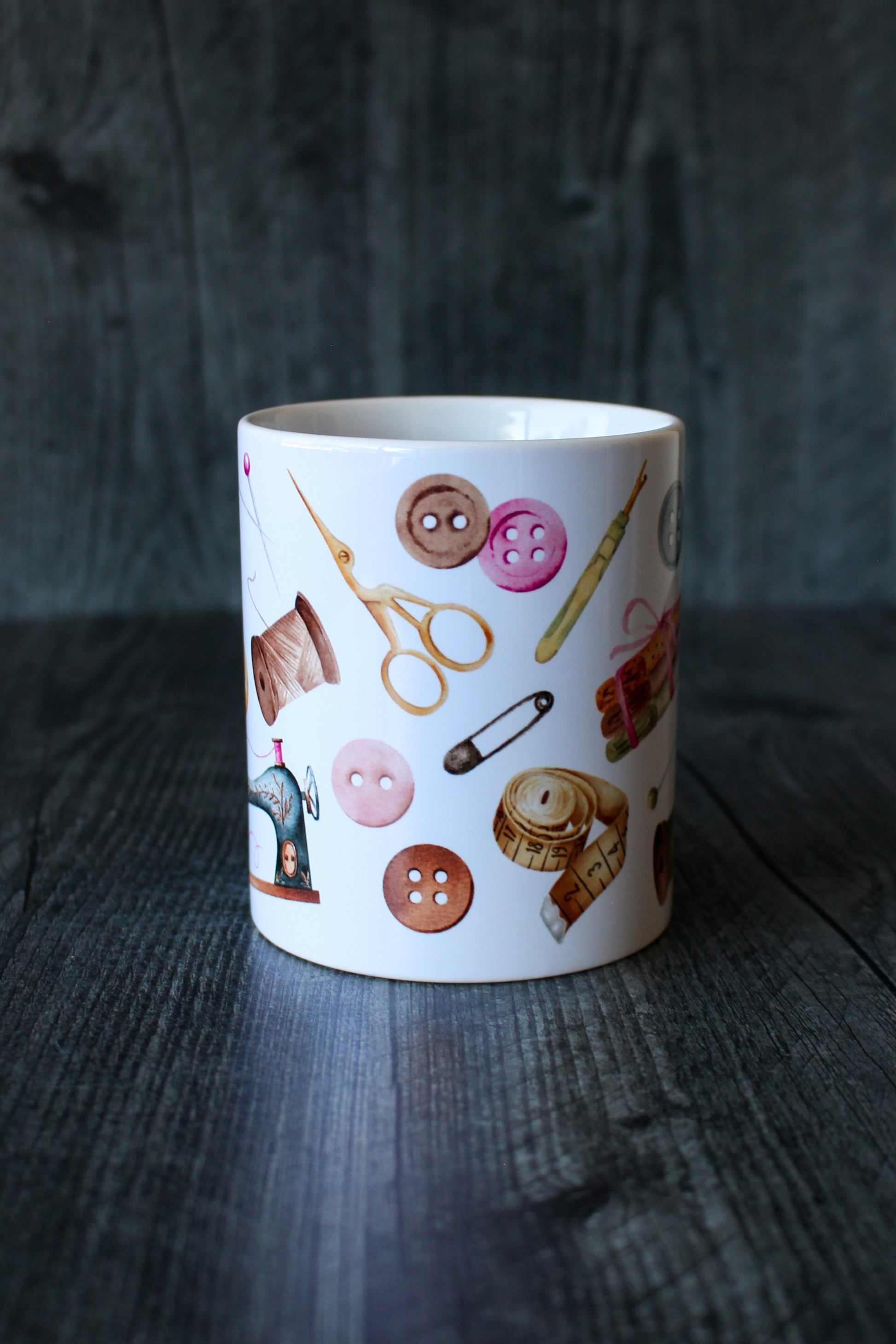 A mug for sewists featuring all the little bits and bobs of your craft.