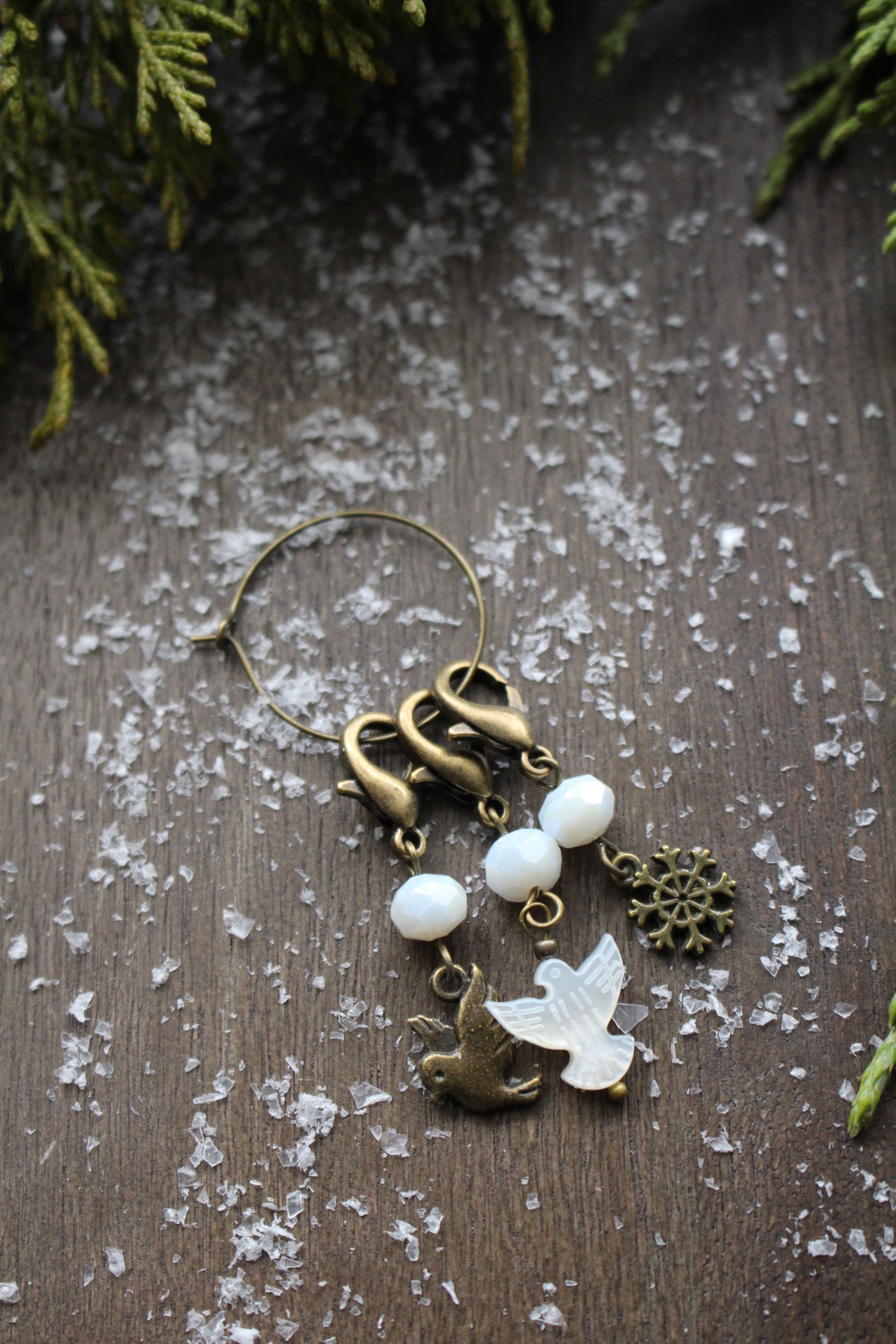 A sweet trio of removable winter progress keepers made from brass charms and a stunning carved seashell bead. Bring a touch of winter beauty to your project as you keep track of your rows. Makes a lovely and unique gift for the knitters in your life.