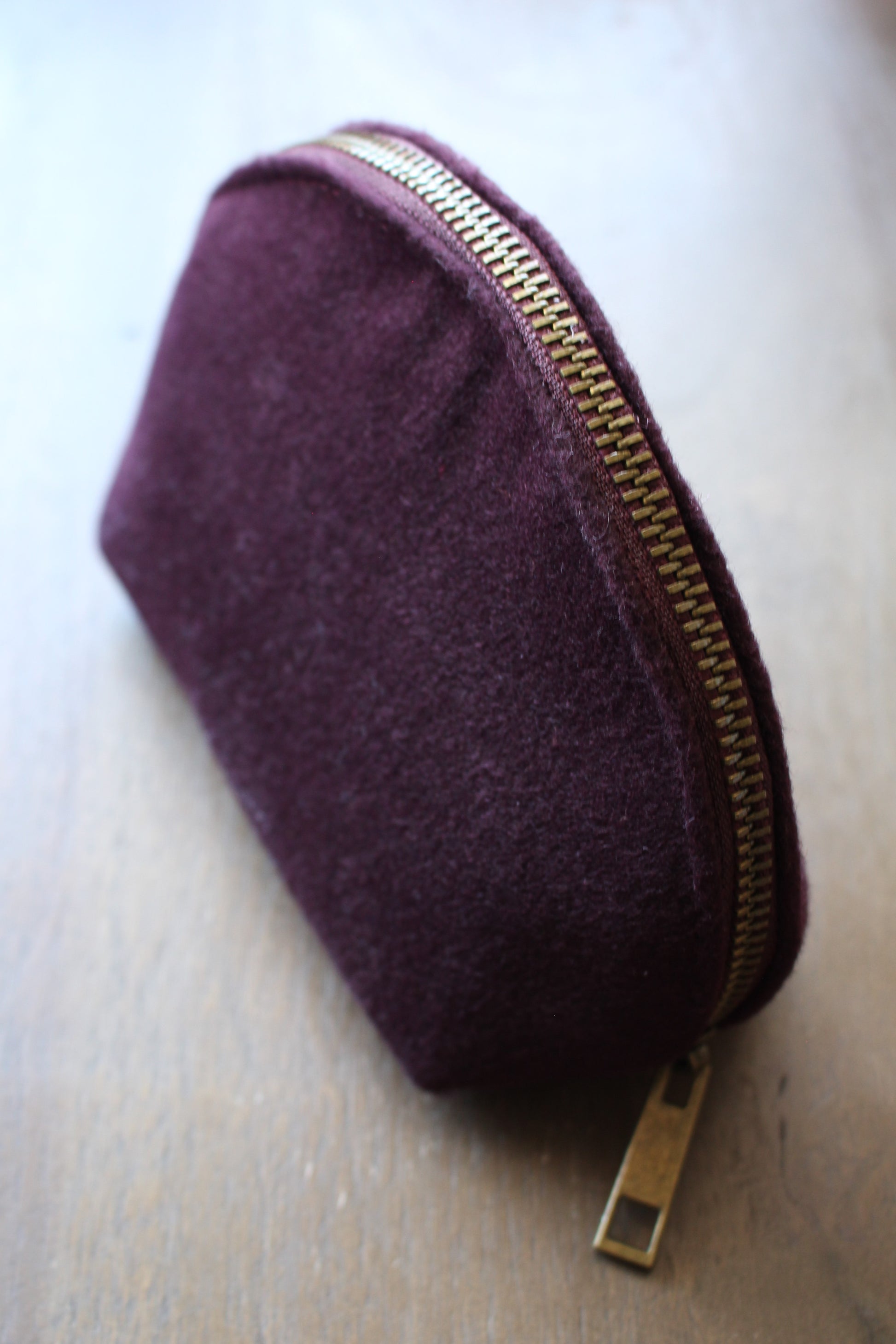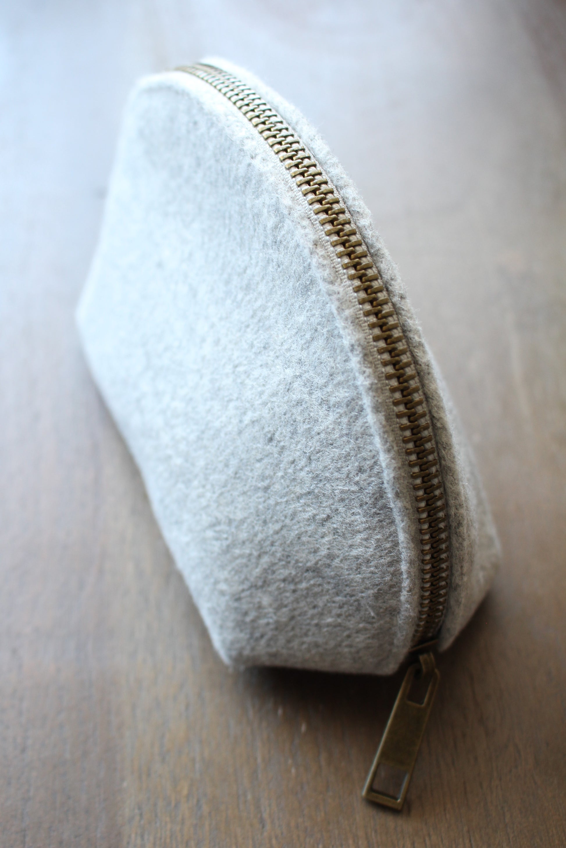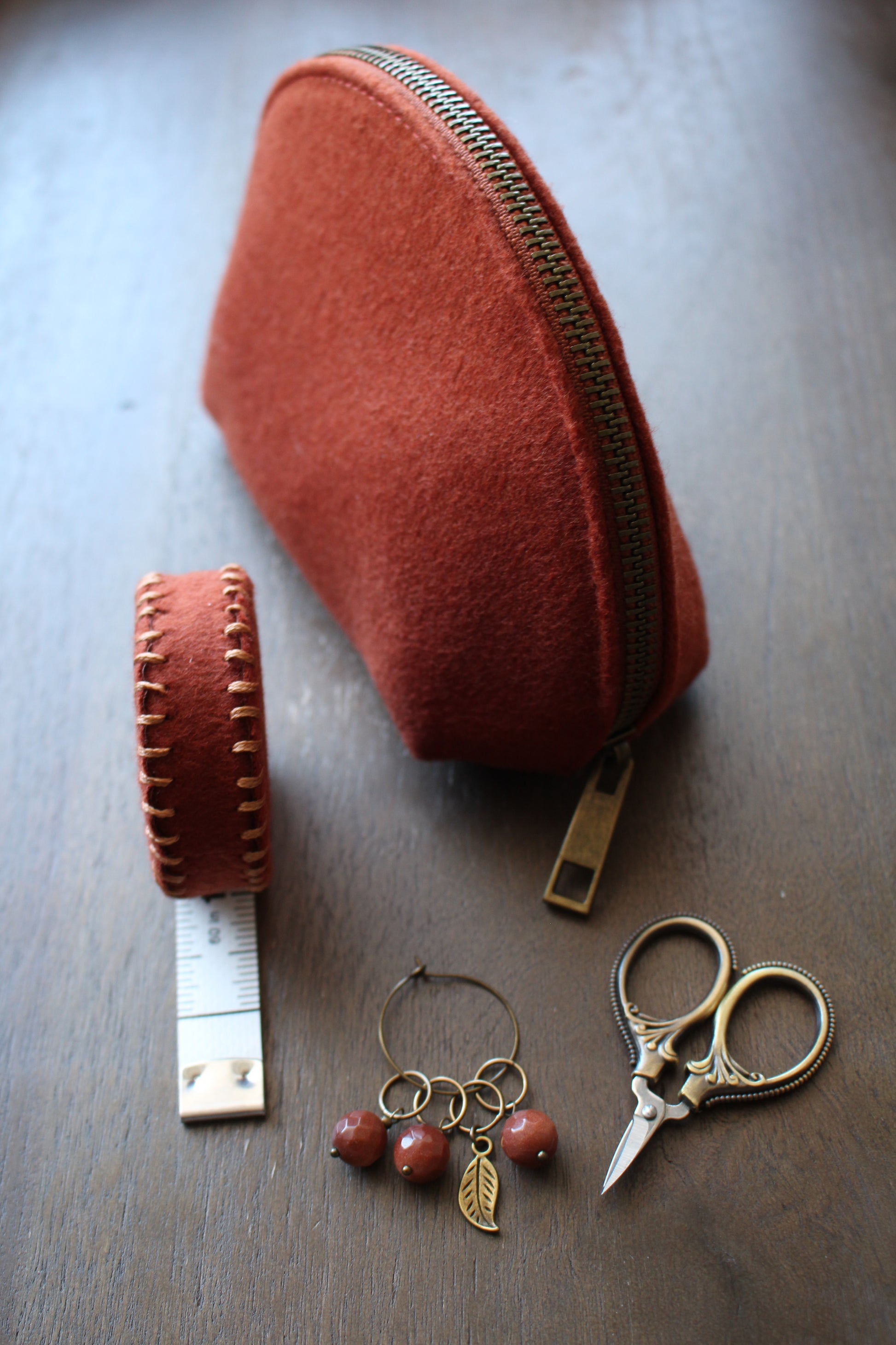 A cute woolen zippered pouch with a designated pocket for your tape measure, a magnetic small scissor pocket and a ribbon loop for stitch markers. Made from wool blend felt with a brass metal zipper. Available in 4 colors.